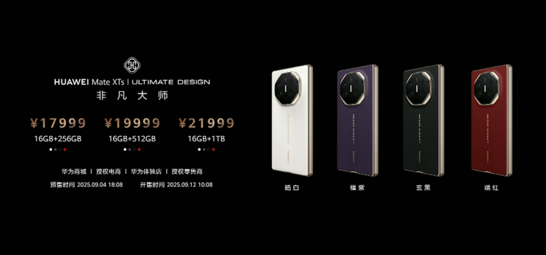 华为三折叠手机Mate XTs非凡大师分三个版本,价格分别为17999元、19999元、21999元,将于9月12日正式开售。