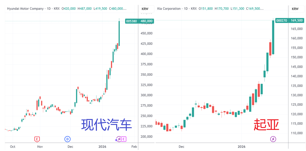 作为推动股指创出新高的最新牛股,现代汽车周一大涨16%,其姐妹公司起亚也大涨12%,均创历史新高。