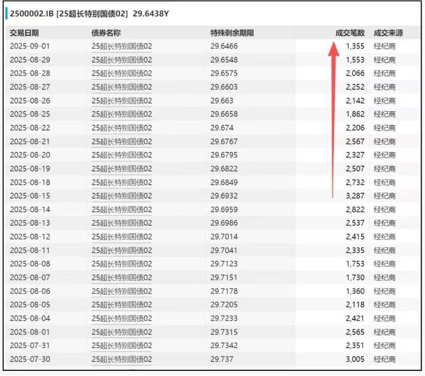 这一持续的下跌自然也引起了机构的注意。有业内人士透露,近两日,债券市场交易活跃度大幅下降,机构观望氛围浓厚。从超长特别国债交易来看,9月1日成交笔数仅1255笔,较8月中下旬几近腰斩。