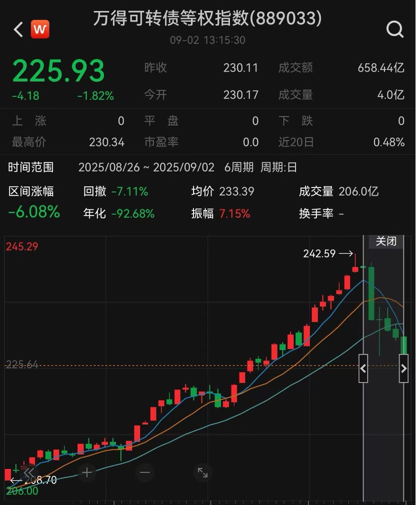 截至9月2日午后1点,万得可转债等权指数下行1.82%,这是该指数连续6个交易日,累计下跌超6个百分点,几乎抹去了8月初以来的涨幅。