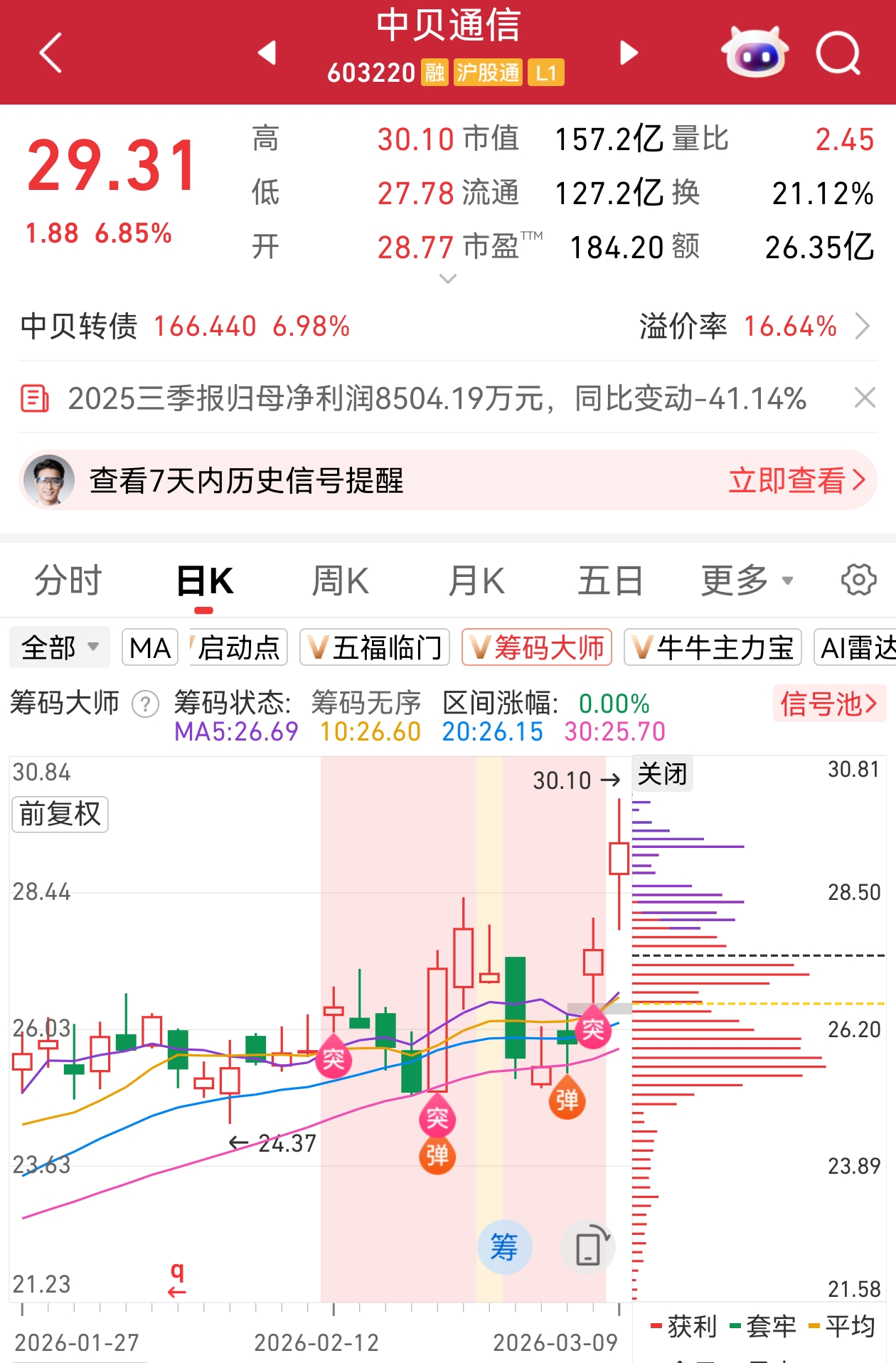注:“筹码大师”显示,中贝通信近期积极信号频出:2月12日首次出现“突”信号,2月26日出现“突”、“弹”双信号,3月5日出现“弹”信号,3月6日出现“突”信号,今日险些触及涨停!