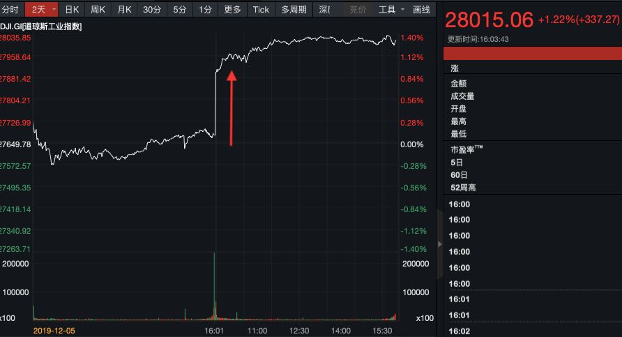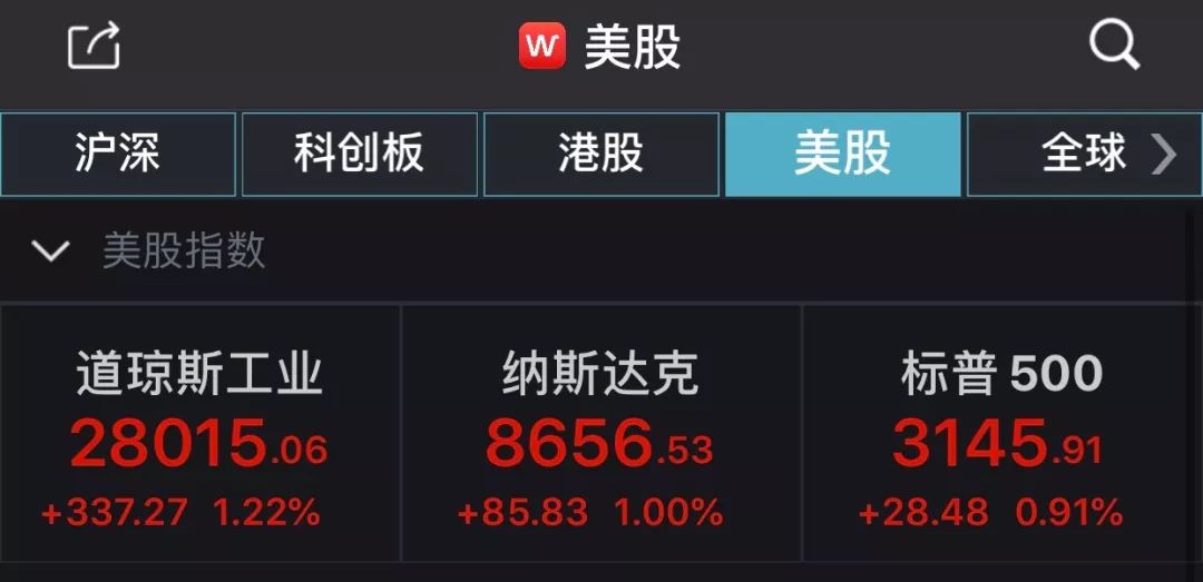 道指大涨超300点,收涨1.22%,重回28000点关口上方,报收28015.06点;标普500指数涨幅达到0.91%,报收3145.91点;纳指上涨1%,报收8656.53点。
