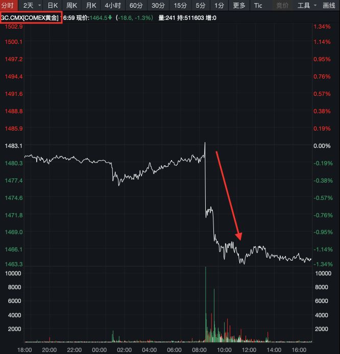 在市场风险偏好提升的情况下,避险资产价格受挫。COMEX黄金价格短线下挫,报收1464.5美元,跌幅1.25%。