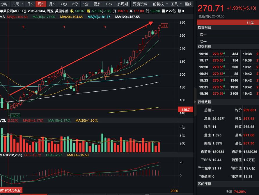 值得一提的是,昨夜苹果公司股价走强,盘中一度涨逾2%,创下历史新高271美元/股,最终收涨1.93%,报270.71美元/股,市值升破12000亿美元。