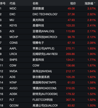 科技股中的芯片股表现强劲。美光科技上涨2.81%,意法半导体、亚德诺、微芯科技均涨超2%,英伟达、英特尔、高通、博通、恩智浦半导体等涨超1%,台积电涨幅0.83%。