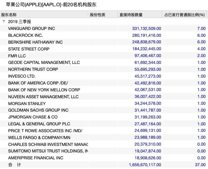 此外,还有景顺、美银、梅隆银行、摩根斯坦利、高盛、摩根大通等一众机构对苹果公司持股1%。