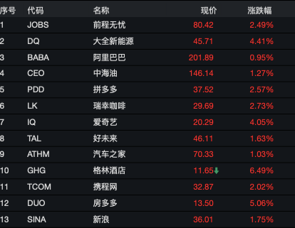 热门中概股跟涨,爱奇艺涨超4%,宜人贷涨逾3%,瑞幸咖啡、趣店、拼多多、唯品会、携程网涨幅均在2%以上,阿里巴巴涨近1%,京东涨幅1.2%。