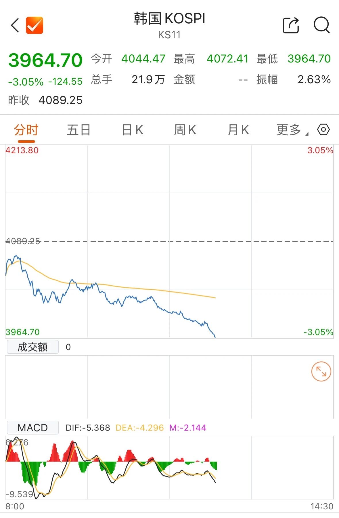 除日本股市外,韩国股市18日也显著下挫。韩国综合指数截至发稿跌超3%。