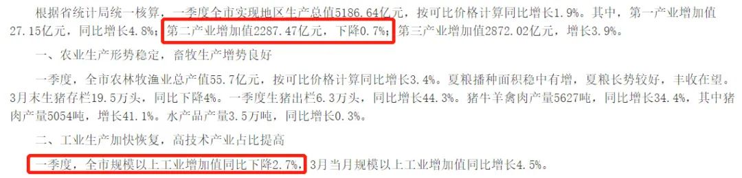 探究可见,苏州在2023年第一季度,第二产业增加值2287.47亿元,同比下降0.7%。其中,苏州规模以上工业增加值同比下降2.7%。