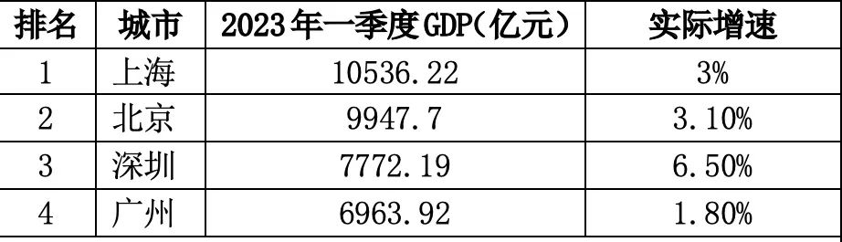 2023年一季度GDP排名,上海独占1万亿元头衔、北京距离1万亿元一步之遥、深圳以6.5%实际增速“狂飙”、广州重回中国第四城。