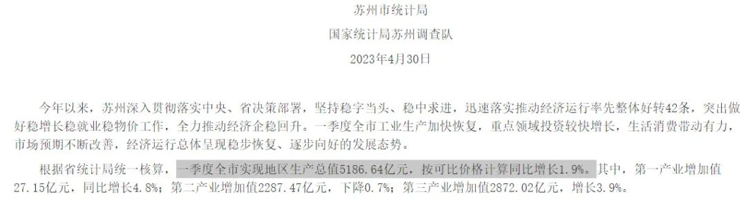 有别于江苏城市群整体向上,苏州在2023年一季度GDP为5186.64亿元,同比增长1.9%。
