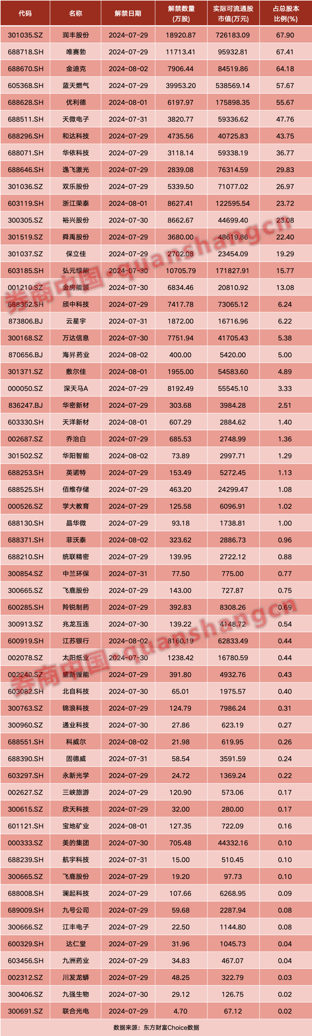 数据显示,本周(7月29日~8月2日)共有59家公司限售股陆续解禁,合计解禁量18.85亿股,按7月26日收盘价计算,解禁市值为283.55亿元。