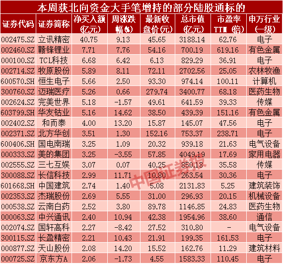 具体到个股来看,立讯精密高居榜首,本周4个交易日合计净流入40.75亿元;赣锋锂业居次,同期净流入7.71亿元;TCL科技排名第三,净流入6.68亿元;往后依次为牧原股份、恒生电子、迈瑞医疗、完美世界和华友钴业5股,净流入额分别为5.89、5.66、5.26、5.18、5.16亿元;另有和而泰、北方华创、国电南瑞、美的集团和三七互娱5股净流入额也较高,均在3亿元以上。