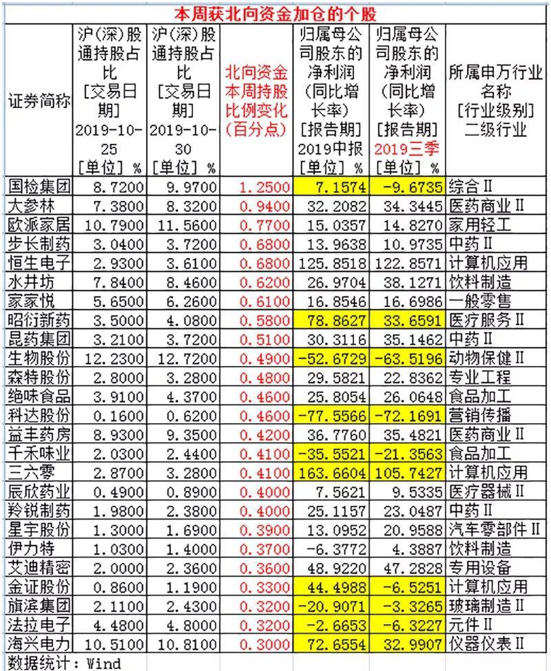细看其本周的加仓情况(对比10月25日与10月30日的持股比例变化),部分三季报业绩不及预期,甚至净利润同比下滑的公司迎来北向资金的逆市买入。