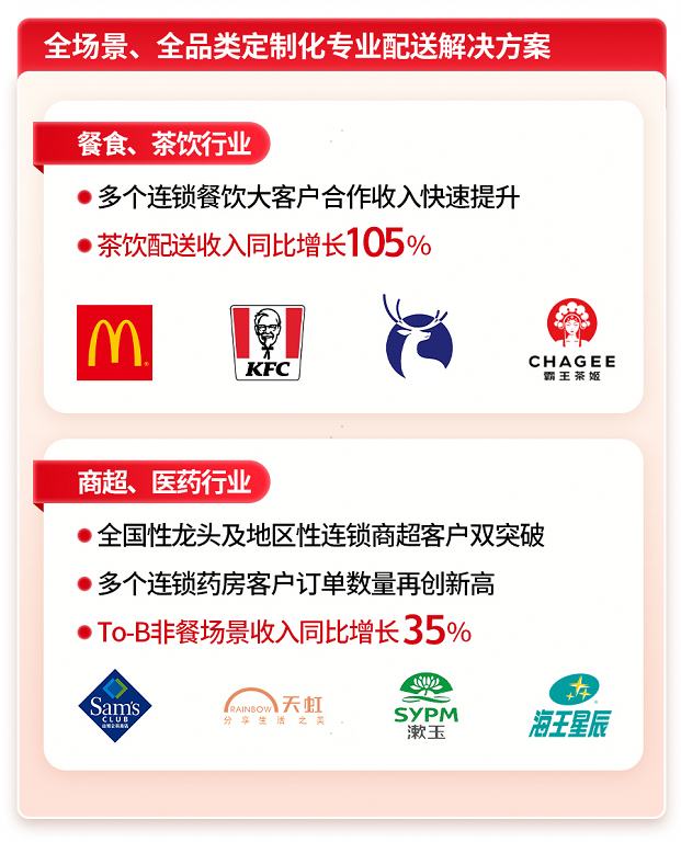 基于此,上半年,公司平台上的年活跃商家规模同比增长55%,达到85万,与KA合作占比和收入保持领先。期内,公司茶饮配送收入同比增长105%,TO B非餐场景收入同比增长35%,商超便利、医药、母婴等品类均取得高双位数增长。