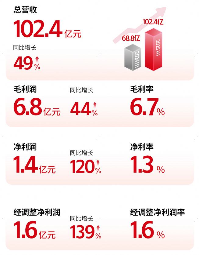 8月28日,顺丰同城正式发布2025年中报。上半年,该公司营收102.4亿元,同比增长49%。与此同时,期内公司净利润为1.4亿,同比增长120%,经调整净利润则为1.6亿,同比增长139%,自2023年率先行业扭亏为盈后收入利润持续双高增。