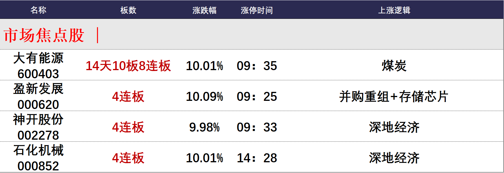 板块方面,市场整体热度下降,量能持续萎缩,防御性板块仍表现活跃,煤炭板块延续强势,叠加低价属性的安泰集团、辽宁能源、云煤能源、陕西黑猫纷纷涨停;银行板块亦有亮眼表现,虽然农业银行止步14连阳,但邮储银行、民生银行、兴业银行等低位银行积极补涨。受消息刺激,深圳本地股早盘大幅高开,广田集团、深赛格、深物业A一字涨停,建科院20CM涨停。