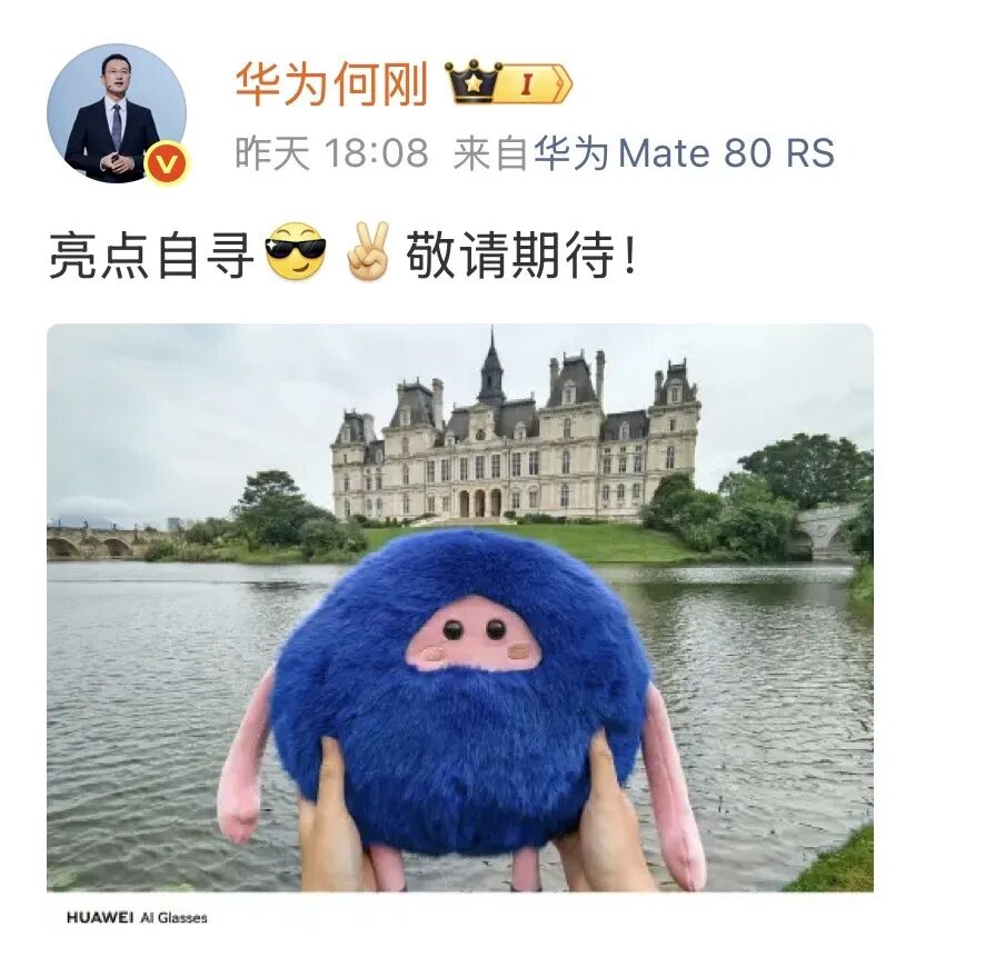 4月9日,“华为AI眼镜即将发布”词条冲上微博热搜。就在4月8日,华为终端BG CEO何刚通过微博发布一张带有“HUAWEI AI Glasses”水印的第一视角图片,并配文“亮点自寻,敬请期待”,迅速引发数码博主及行业广泛关注。