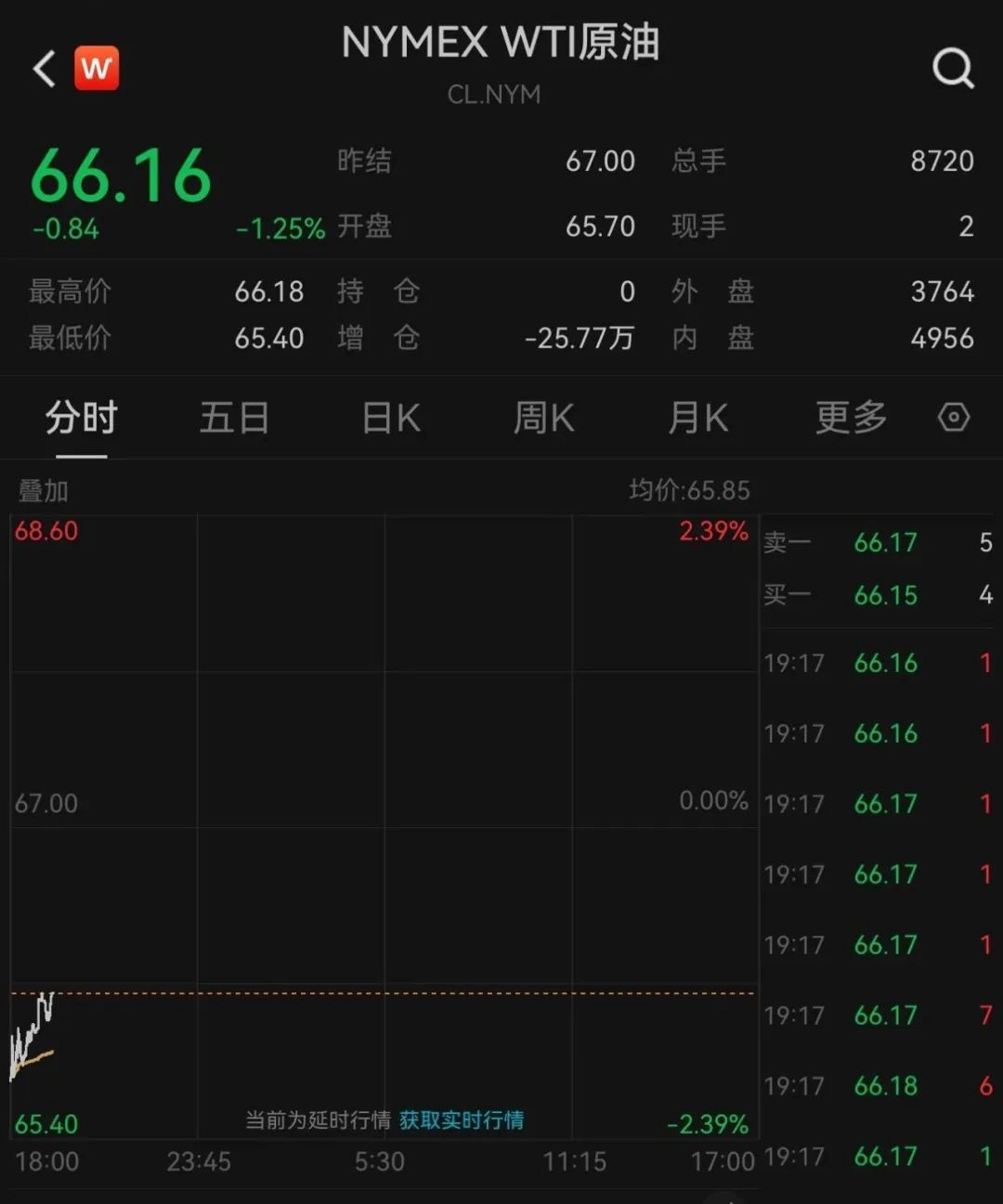 WTI原油低开并一度跌超2%,截至发稿最新跌幅为1.25%,报66.16美元/桶。