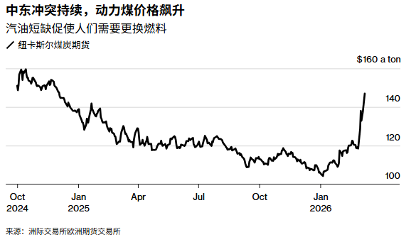 随着中东地区军事冲突的骤然升级,全球能源供应链正面临严峻挑战,动力煤价格受此影响已飙升至一年多以来的最高水平。本周一,亚洲基准纽卡斯尔煤炭期货价格大幅跳涨约9.3%,触及每吨150美元关口,刷新了自2024年11月以来的最高纪录;与此同时,欧洲市场反应同样剧烈,鹿特丹煤炭价格于3 月 2 日上涨约13%至每吨119.50美元,创下52周新高。