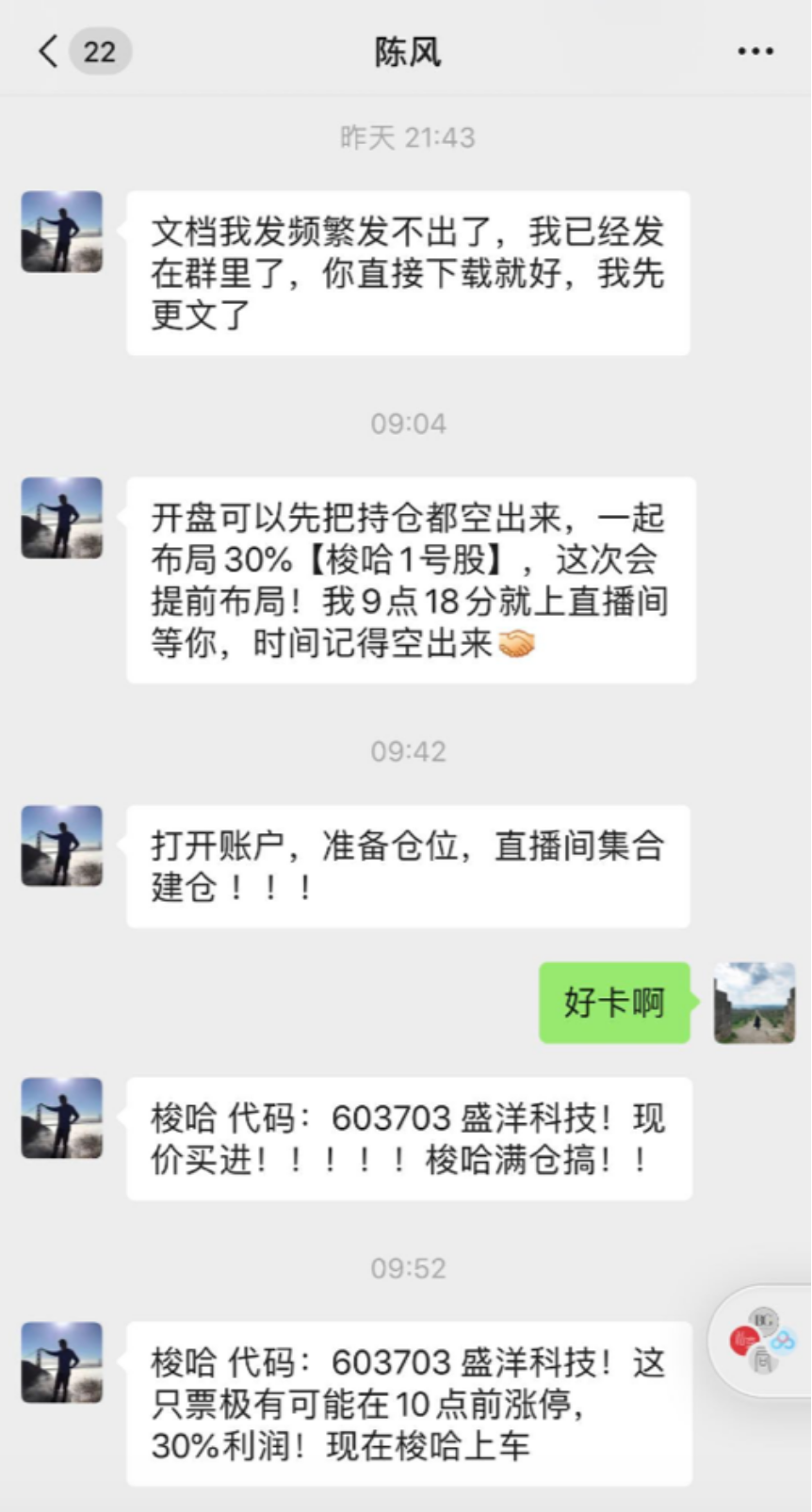 6月3日,当天有多个微信号在不同直播炒股群内,同时强力推荐盛洋科技,荐股者声称股价将瞬间爆发涨停,建议股民全仓速抢。但事实上盛洋科技股价当天早盘短暂冲击涨停后掉头向下,最终收盘竟以跌停报收。多位损失惨重的股民发现,早盘叫嚣全仓买入,有30%盈利空间的荐股群已经解散,群主不再回复个人信息。