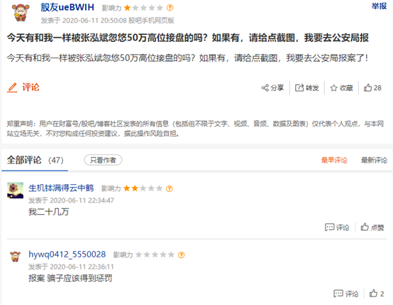 有投资者意识到可能已经被骗。有股友在股吧表示,自己被忽悠高位接盘买入50万,并号召同样的受害者去报案。