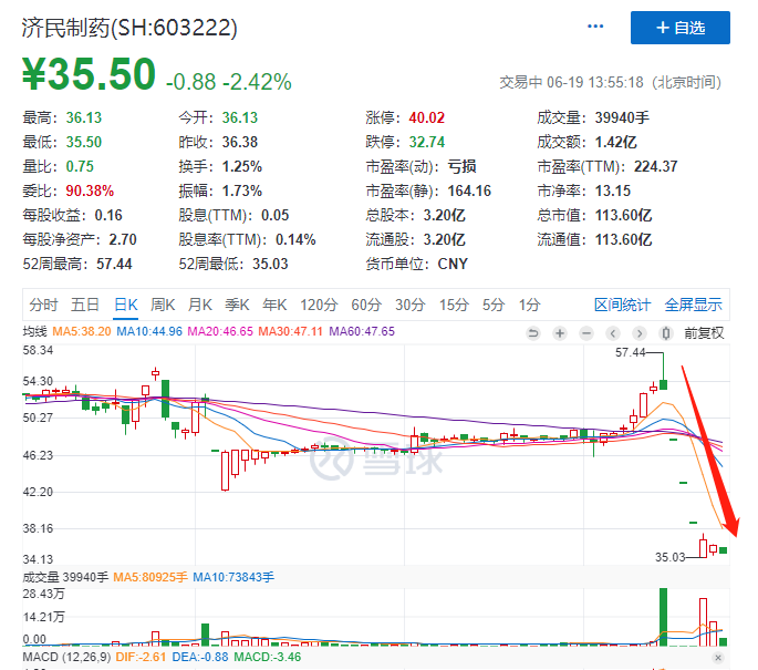 6月11日,通常换手率极低的济民制药突然放出天量,全天成交额近16亿元,换手率达到8.88%。此后,济民制药连续三个交易日一字跌停,众多投资者遭“闷杀”。