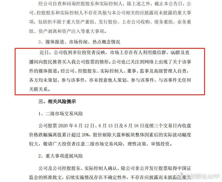 济民制药披露股价异动公告称,近日,公司收到多位投资者反映,市场上存在有人利用微信群、QQ群及直播间向股民推荐买入公司股票的情形。公司也已关注到网络上出现了关于该事件的媒体报道。经公司、控股股东、实际控制人、董事、监事及高级管理人自查,各方均未策划、参与该事件,亦未授意他人策划、参与该事件,与该事件无任何关联关系。