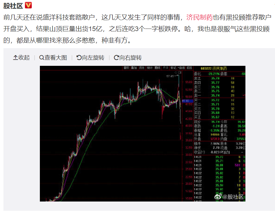 4月初,有报道称多地投资者在同花顺的股票账户集体被盗,持仓股被清空后全仓买入了济民制药。当天,亦有大量微信群或人员荐股济民制药,称主力即将配合拉升,甚至承诺保底收益。部分投资者未经受住诱惑全仓买入,次日便遭遇一字跌停,损失惨重。