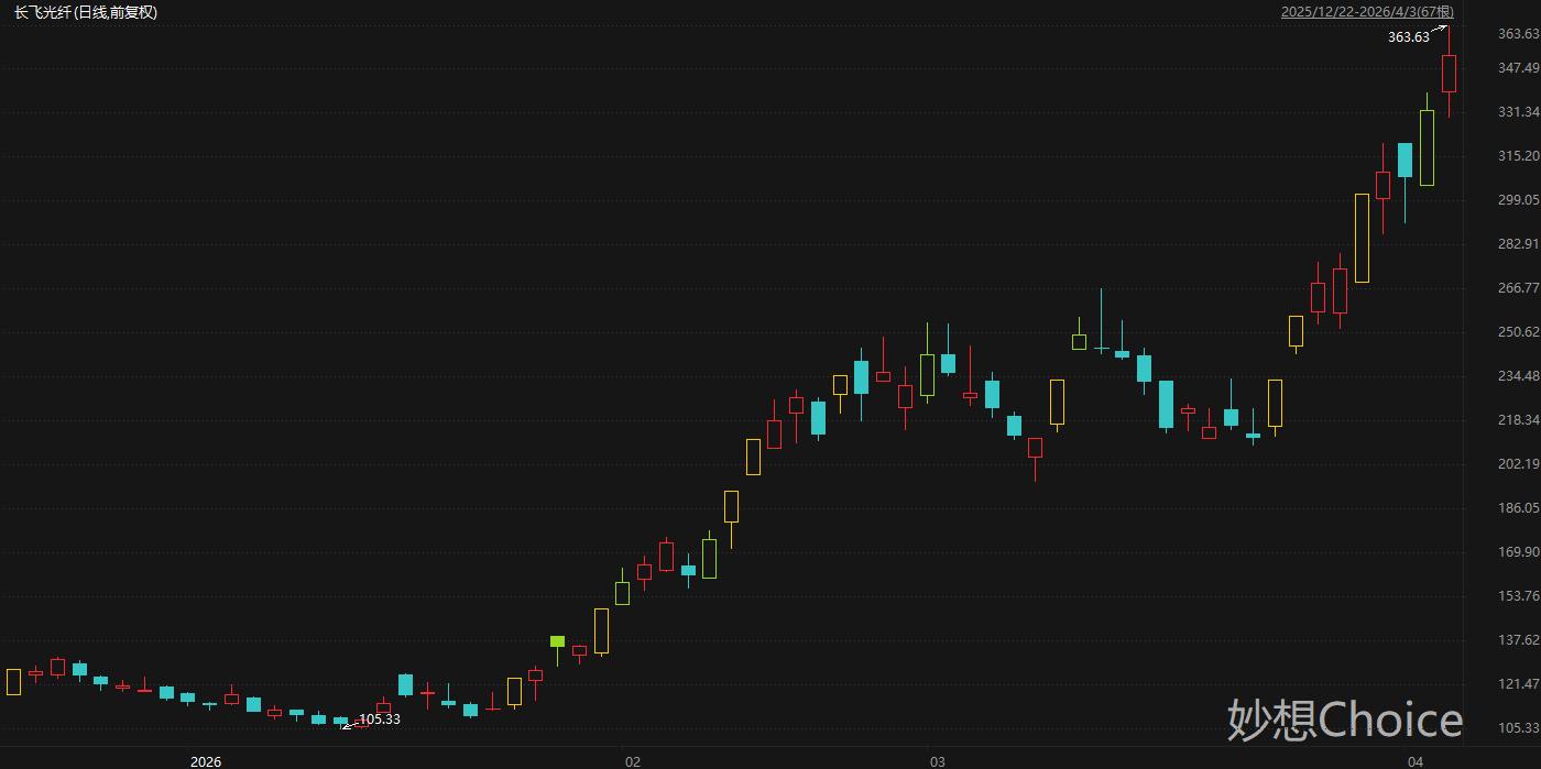 光纤光缆行业领先企业长飞光纤周五盘中一度触及363.63元/股,刷新历史新高。拉长时间来看,长飞光纤股价自1月低点迄今累计最大涨幅245%。余伟民等人研报认为,长飞光纤是全球领先的光纤预制棒、光纤、光缆及综合解决方案提供商。公司拥有完备的集成系统、工程设计服务与解决方案,为世界通信行业及其他行业提供各种光纤光缆产品及综合解决方案,为全球100多个国家和地区提供优质的产品与服务。