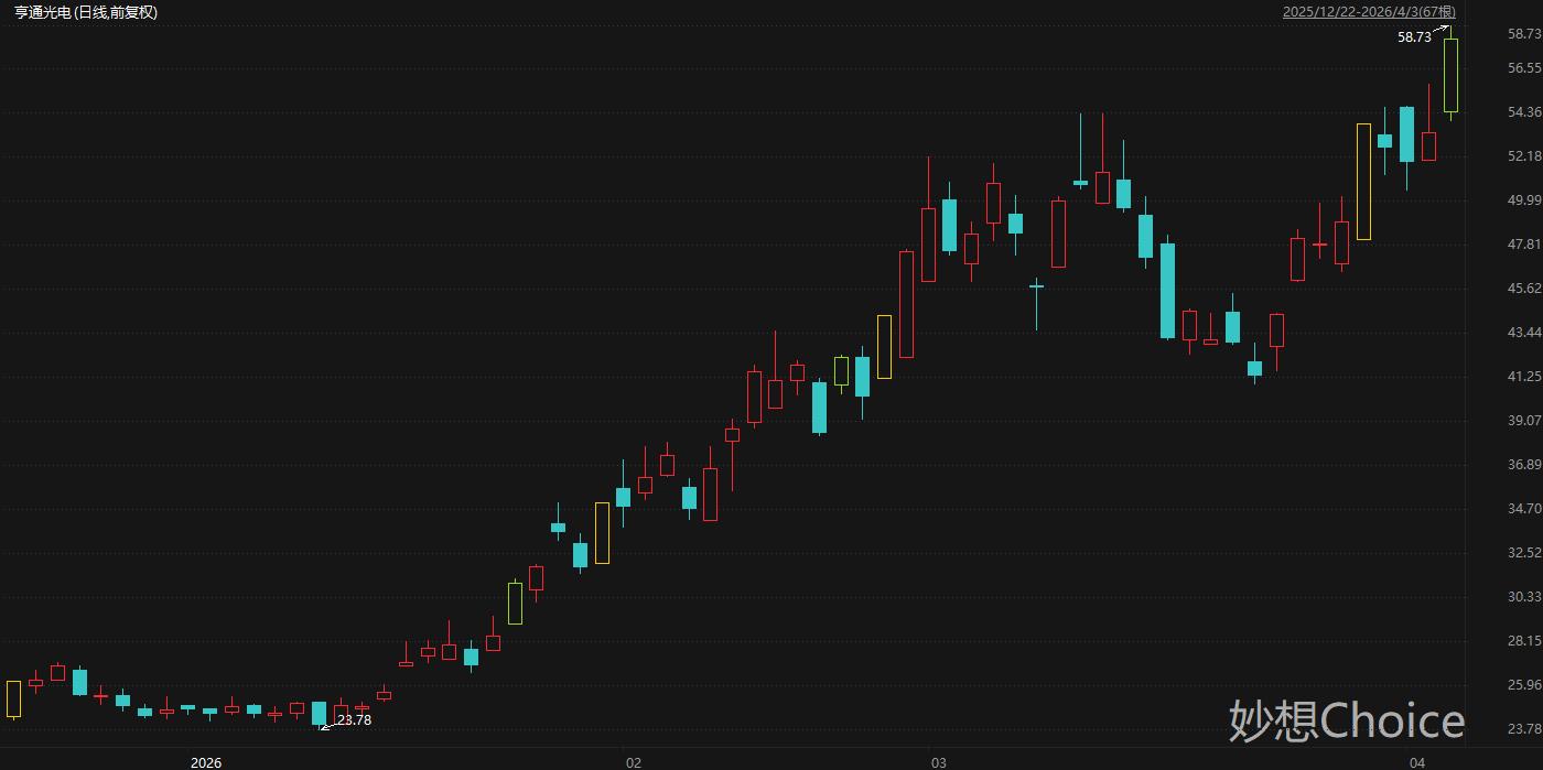 具备跨洋光缆工程能力的亨通光电周五收涨超8%,盘中一度触及58.73元/股,拉长时间来看,亨通光电股价自1月低点迄今累计最大涨幅147%。东兴证券分析师石伟晶3月26日研报认为,亨通光电是全球光通信行业头部企业,能够大规模一体化开发与生产光纤预制棒、光纤和光缆。当前AI应用及数据中心建设快速发展,驱动光纤价格持续提升。公司具有数据中心特种光纤产能优势,有望显著受益AI数据中心光纤需求持续扩大的产业浪潮。