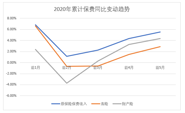 银保监会近日发布的5月保费数据显示,前5月保险业原保险保费收入为230.64亿元,同比增长5.54%,较前4月4.34%的同比增幅进一步上升1.2个百分点,行业累计保费增速在疫情后已进入回暖阶段。