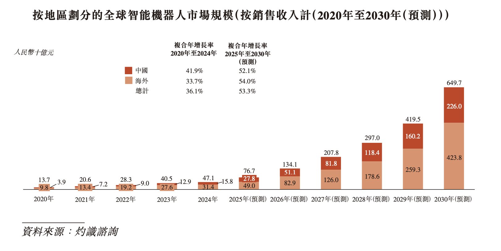 根据行业顾问灼识咨询的报告,这是一个被宏大未来“喂养”的赛道。按销售收入计,全球智能机器人市场规模正以惊人的速度膨胀,从2020年的137亿元猛增至2024年的471亿元,年复合增长率达36.1%。更为激进的是,市场预计到2030年将达到6497亿元,这意味着未来五年的年复合增长率将高达53.3%。