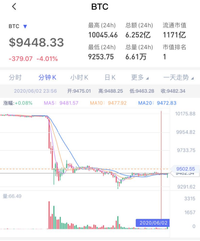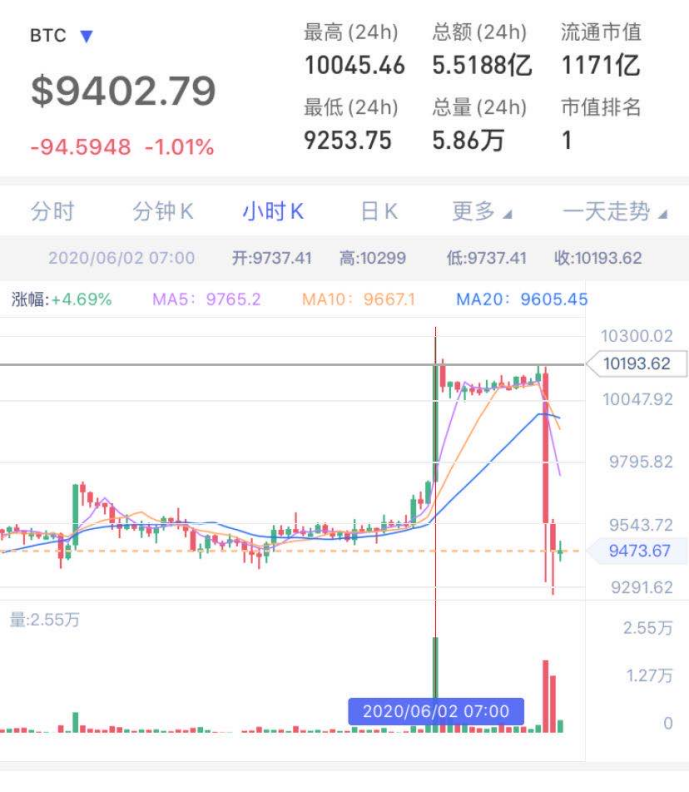北京时间6月2日早七点左右,比特币兑美元价格快速拉升,直线突破10000美金。