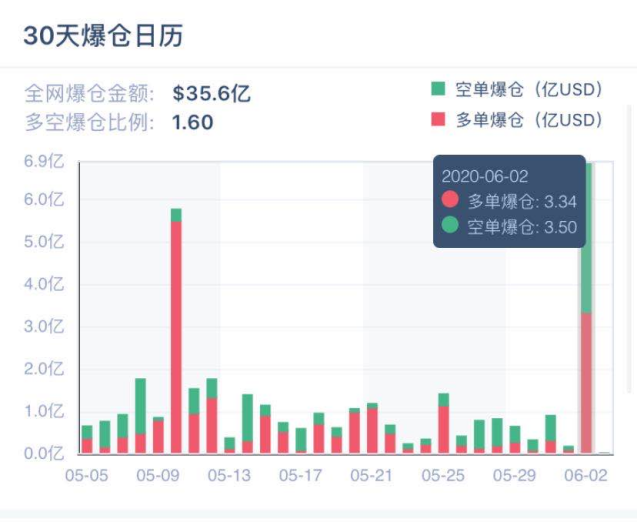 据币Coin数据,6月2日全天,全网比特币交易平台的爆仓金额高达6.85亿美金,约合人民币48.63亿元,创下30天高点,甚至高过了5月10日。据悉,5月10日早上,比特币从9559美元的高位突然跳水,25分钟后比特币价格暴跌超过14%,当天的爆仓金额为5.77亿美金。