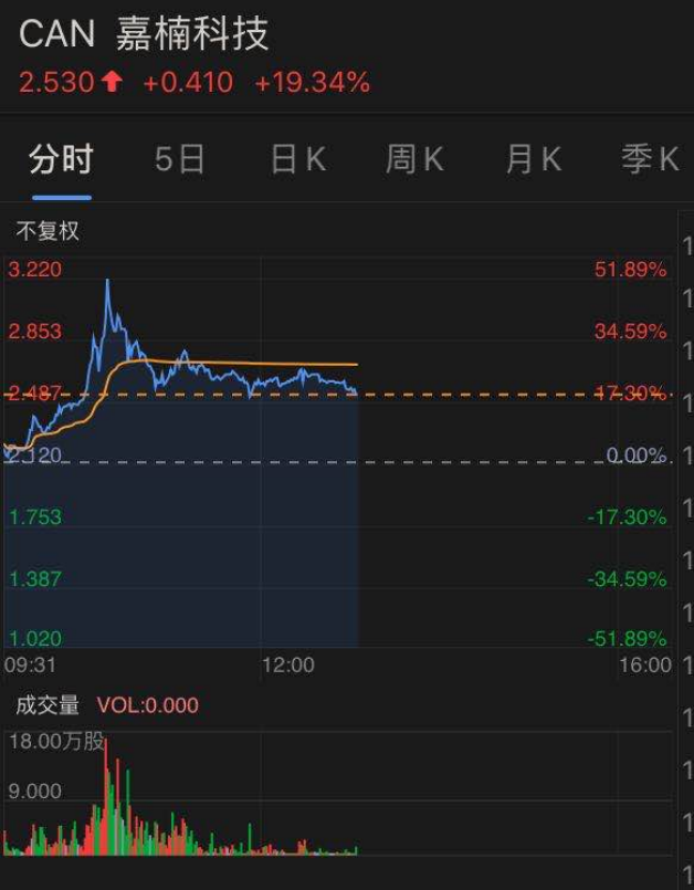 矿机厂商嘉楠科技一度涨超50%,领涨中概股。