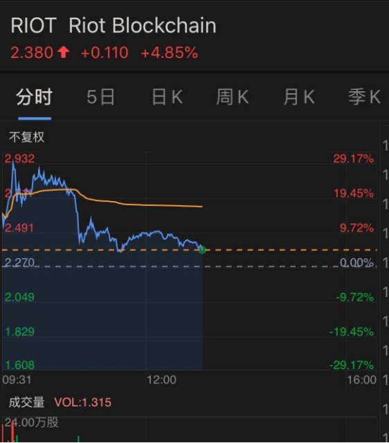 Marathon Patent Group一度涨超30%,Riot Blockchain一度上涨29.17%。