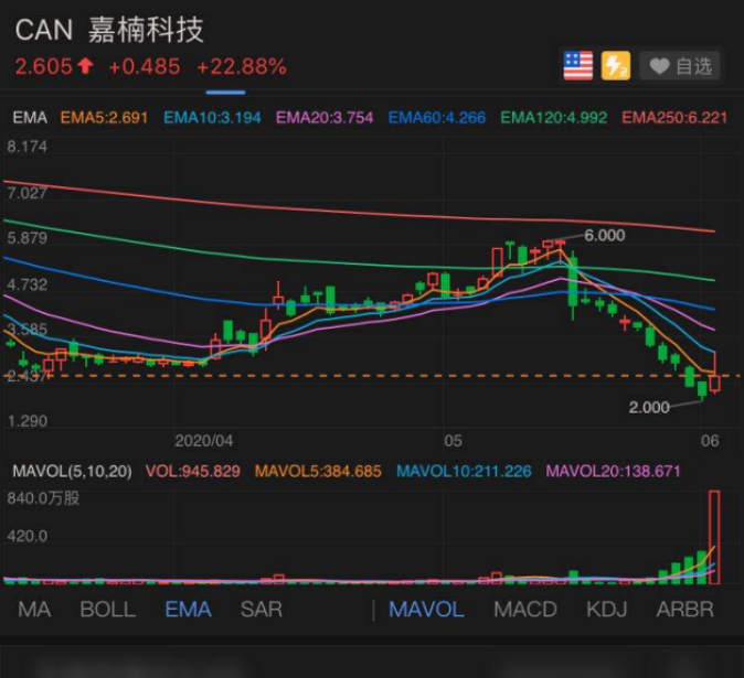 美国时间6月1日,嘉楠科技收于2.12美金,与5月14日6美金的高点相比,已经跌去64.67%。
