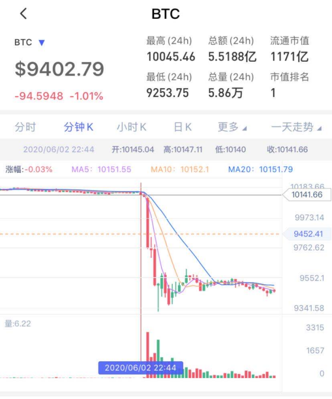 昨夜22点44分,比特币对美元的价格高点为10147美元;而比特币价格立即直线下跌,在22点49分触及9350美元的低点,在短短的六分钟内跌了797美金,跌幅高达7.85%。