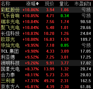 下游,利亚德、洲明科技、奥拓电子以及京东方A、TCL集团、深天马A。