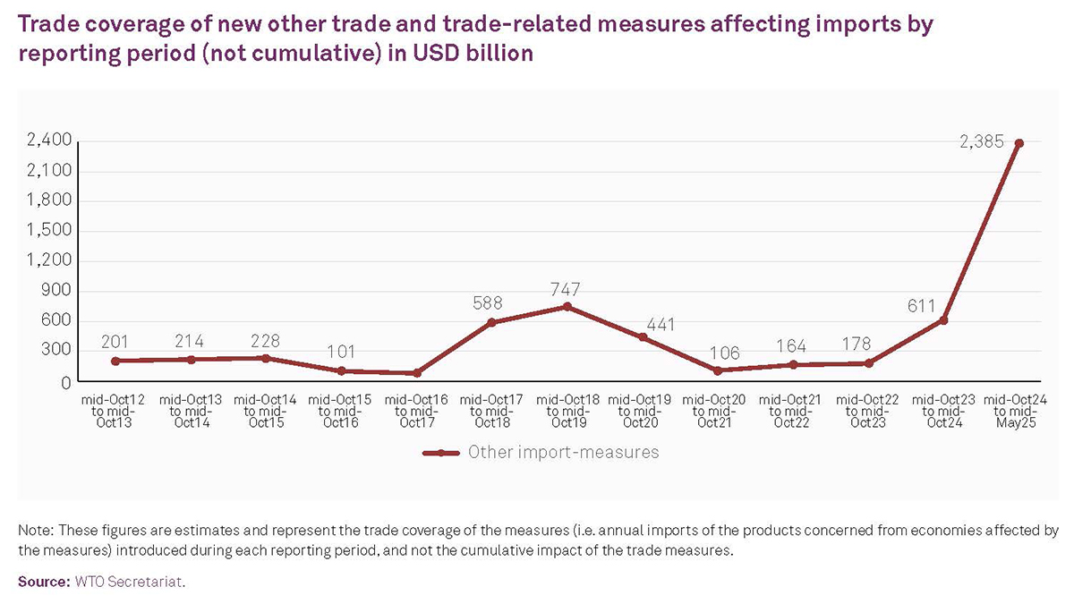世贸组织(WTO)最新监测数据显示,2024年10月至2025年5月期间,新关税的急剧上升及其覆盖的全球贸易份额增加,导致全球贸易格局变得动荡不安且难以预测。