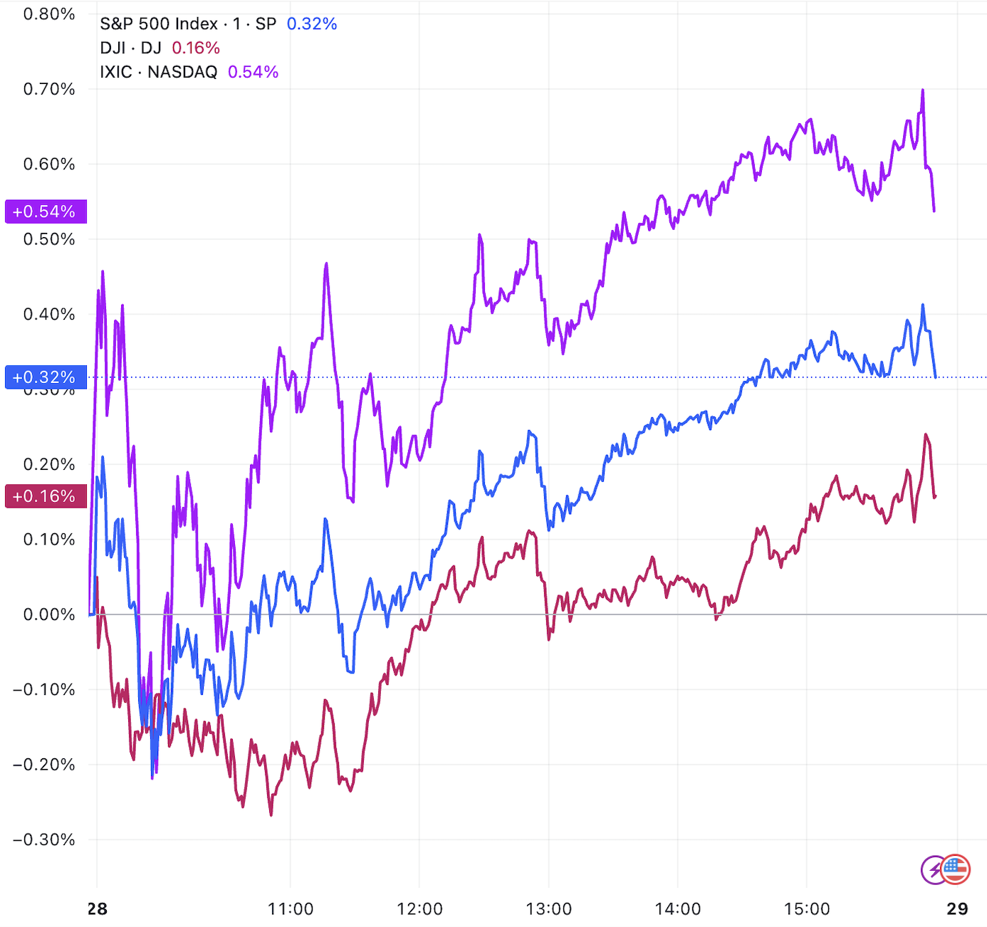 截至收盘,道琼斯指数涨0.16%,报45,636.90点;标普500指数涨0.32%,报6,501.86点;纳斯达克指数涨0.53%,报21,705.16点。