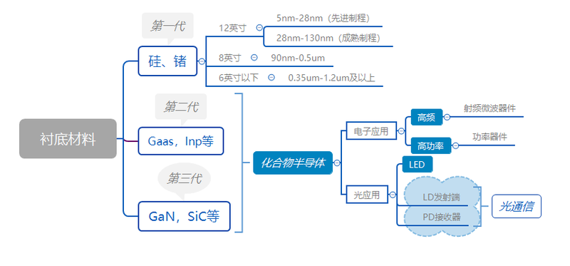 衬底是具有特定晶面和适当电学,光学和机械特性的用于生长外延层的洁净单晶薄片,按照演进过程可分为三代: 以硅、锗等元素半导体材料为代表的第一代,奠定微电子产业基础; 以砷化镓(GaAs )和磷化铟(InP )等化合物材料为代表的第二代,奠定信息产业基础; 以及以氮化镓(GaN )和碳化硅(SiC )等宽禁带半导体材料为代表的第三代,支撑战略性新兴产业的发展。