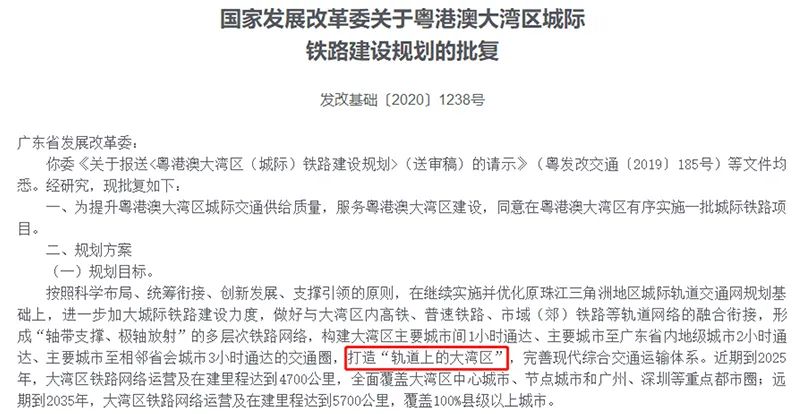 日前,国家发改委官方网站发布了关于粤港澳大湾区城际铁路建设规划的批复,同意在粤港澳大湾区有序实施一批城际铁路项目。根据批复,发改委明确提出,打造“轨道上的大湾区”。