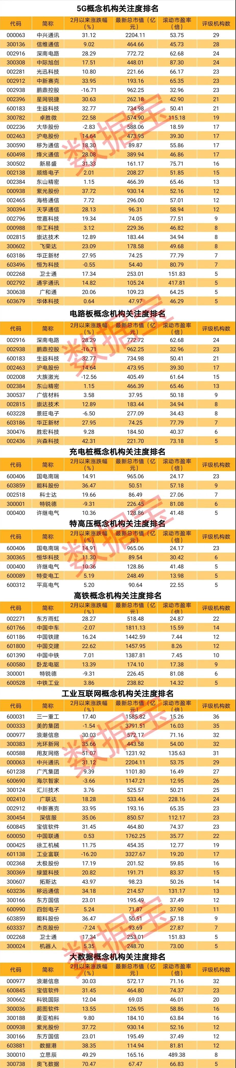 新基建有望成为贯穿全年的投资主题。对于本次会议提出要发力于科技端的基础设施建设,包括5G基建、特高压、城际高速铁路和城际轨道交通、充电桩、大数据中心、人工智能、工业互联网等七大“新基建”板块,证券时报·梳理出机构关注度较高的概念股龙头,以飨读者。