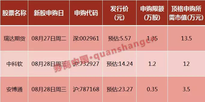 本周共有3只新股申购,分别是瑞达期货、中科软、安博通,申购日期集中在周二和周三,其中安博通为科创板新股,顶格申购仅需3.5万市值。