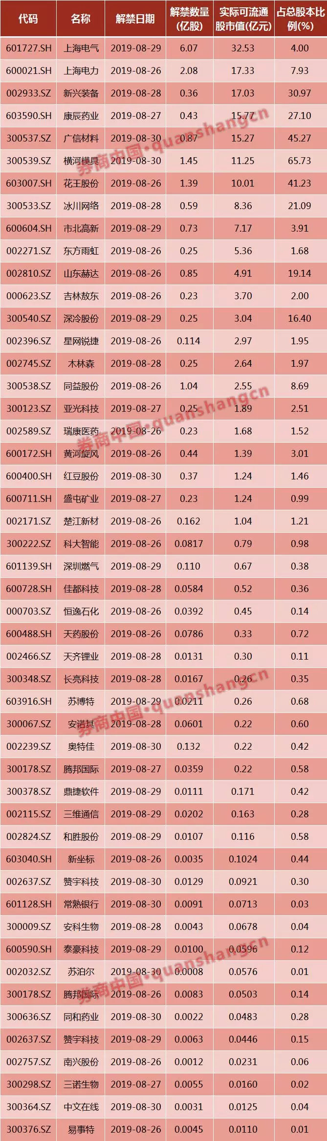 市值来看,解禁市值居前三位的是:上海电气(32.53亿元)、上海电力(17.33亿元)、新兴装备(17.03亿元)。
