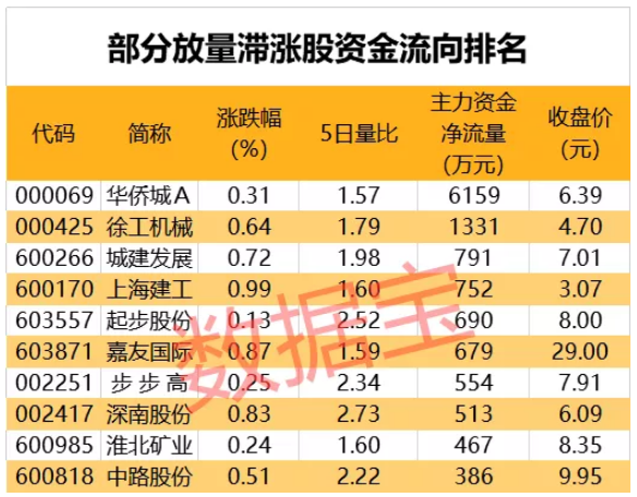 值得注意的是,77只放量滞涨股中,华侨城A、徐工机械、城建发展、上海建工、起步股份等个股主力资金净流入最多,分别达到0.62亿元、0.13亿元、0.08亿元、0.08亿元、0.07亿元。