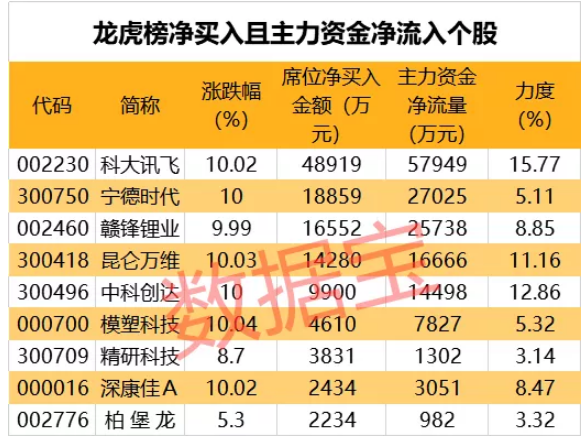 从盘口资金流向来看,主力资金净流入超千万且龙虎榜净买入个股共有12只,其中科大讯飞、宁德时代、赣锋锂业等个股资金净流入金额最大。净流入力度最大的个股有广聚能源、美芝股份、科大讯飞,净流入力度分别为28.98%、27.06%、15.77%。