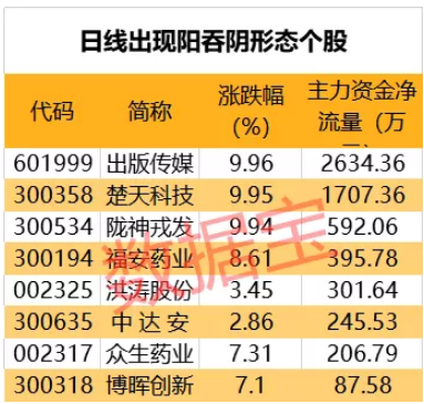 截至最新收盘,两市共有16只个股日K线出现阳吞阴形态,当天涨幅最大的是华扬联众、出版传媒、楚天科技,涨幅分别为9.99%、9.96%、9.95%。
